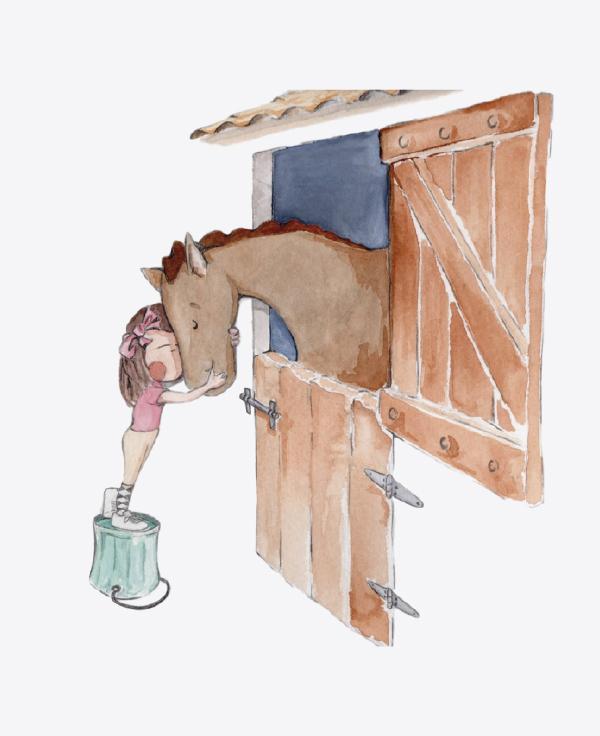 Emotiva reproducción de dibujo en acuarela pintada a mano de niña abrazando y acariciando a su caballo mientras se asoma en el establo de madera, Mi Gran Amigo. Diseño único y exclusivo de Sueños de Cigüeña.