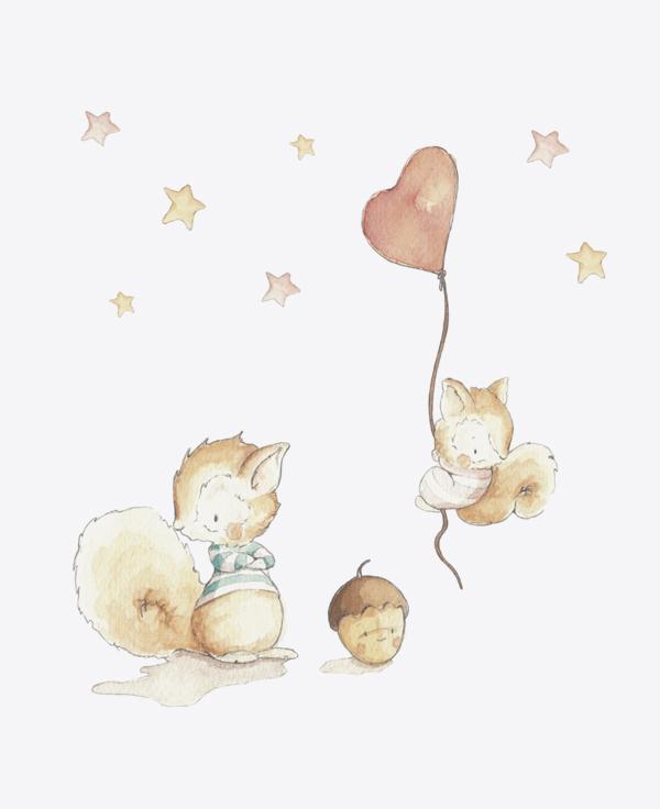 Divertida reproducción de dibujo en acuarela pintada a mano con grupo de ardillas jugando con un globo rojo de corazón, rodeadas de estrellas, Squirrels friends. Diseño único y exclusivo de Sueños de Cigüeña.